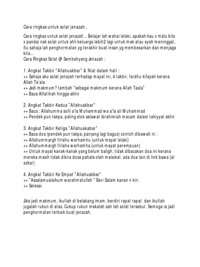 Cara Solat Jenazah Ringkas / Shalat jenazah merupakan salah satu praktik ibadah shalat yang dilakukan umat muslim jika ada muslim lainnya yang meninggal dunia.. Bentuk gerakan sholat jenazah ini berbeda dengan sholat sunat lainnya karena di dalam sholat jenazah tidak ada gerakan ruku dan sujud, jadi sholat ini sebaiknya dilakukan secara berjamaah, meskipun dulalukan sendiri juga juga bisa. Lebih afdhal kalau anda membaca keseluruhan selawat yang dikenali. Anda boleh membaca selawat ringkas dengan membaca ayat yang berwarna pink / merah jambu itu sahaja. Cara mengerjakan solat jenazah cukup mudah. Sholat yang dimaksud adalah sholat jenazah, di mana rasulullah juga telah mencontohkan tata caranya.