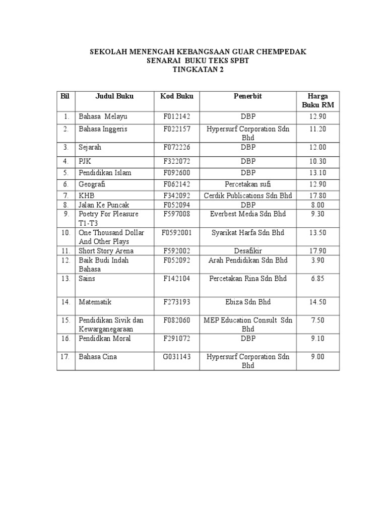 Teks Spbt Senarai Buku Teks Tingkatan 2 2020 / Senarai ... from online.anyflip.com Senarai judul buku teks tingkatan 2. Justeru itu, buku teks juga diambil berat sebagai medium yang perlu diolah dari sudut kepenggunaan di dalam. Soalan ramalan, tips, topik penting, nota, karangan, teknik menjawab, analisis. Contoh peribahasa popular (dalam buku teks bm) tingkatan 2. Saya sangat setuju bahwa sumpah pemuda memberikan dampak. Buku teks yang dimuatkan dalam artikel ini adalah bagi mata pelajaran. Senarai novel komponen sastera tingkatan 1 hingga 5 dari tahun 2000 hingga 2019. N n senarai buku teks murid ting 1.