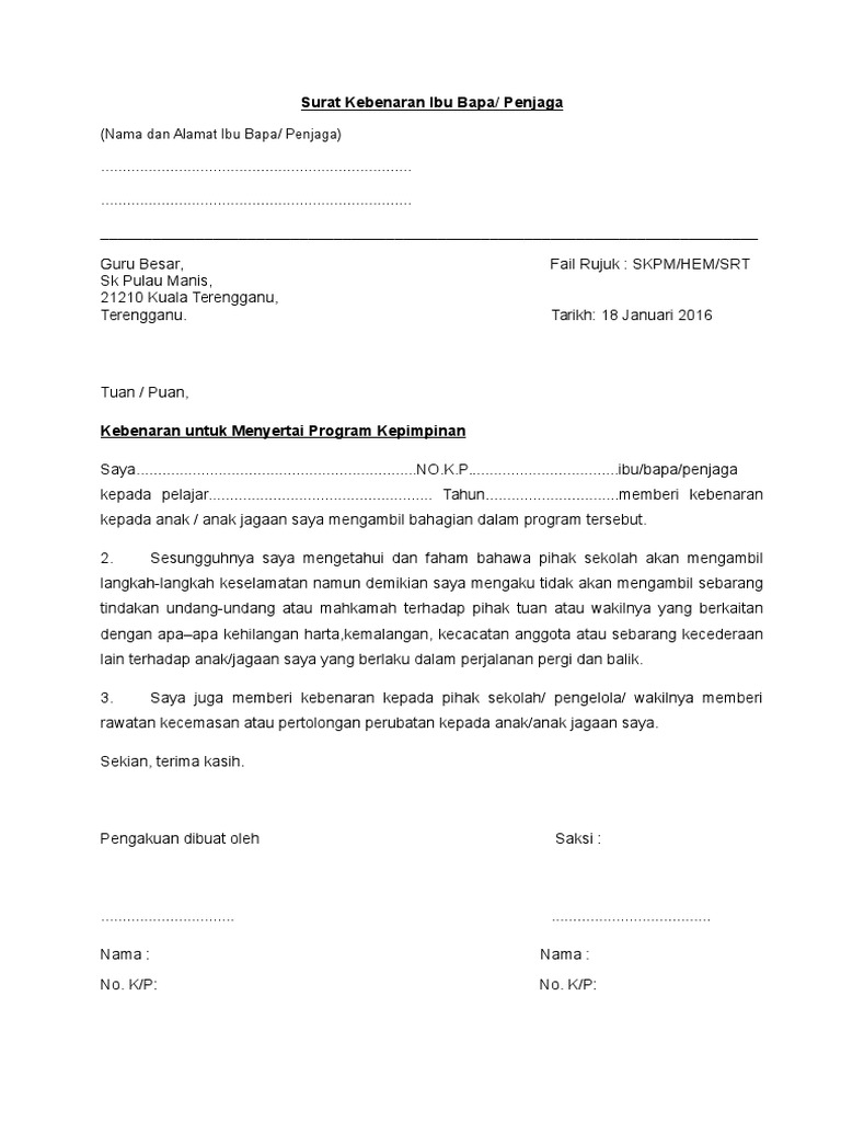 Bapa/ibu/penjaga kepada anak yang bernama : 60%(5)60% found this document useful (5 votes). _ dari tingkatan _ untuk menyertai persatuan agama kristian untuk sesi persekolahan tahun 2012. Persetujuan bertulis ibu bapa atau penjaga murid telah diperolehi. Perkong… baca selengkapnya contoh surat kebenaran ibu bapa untuk lawatan.