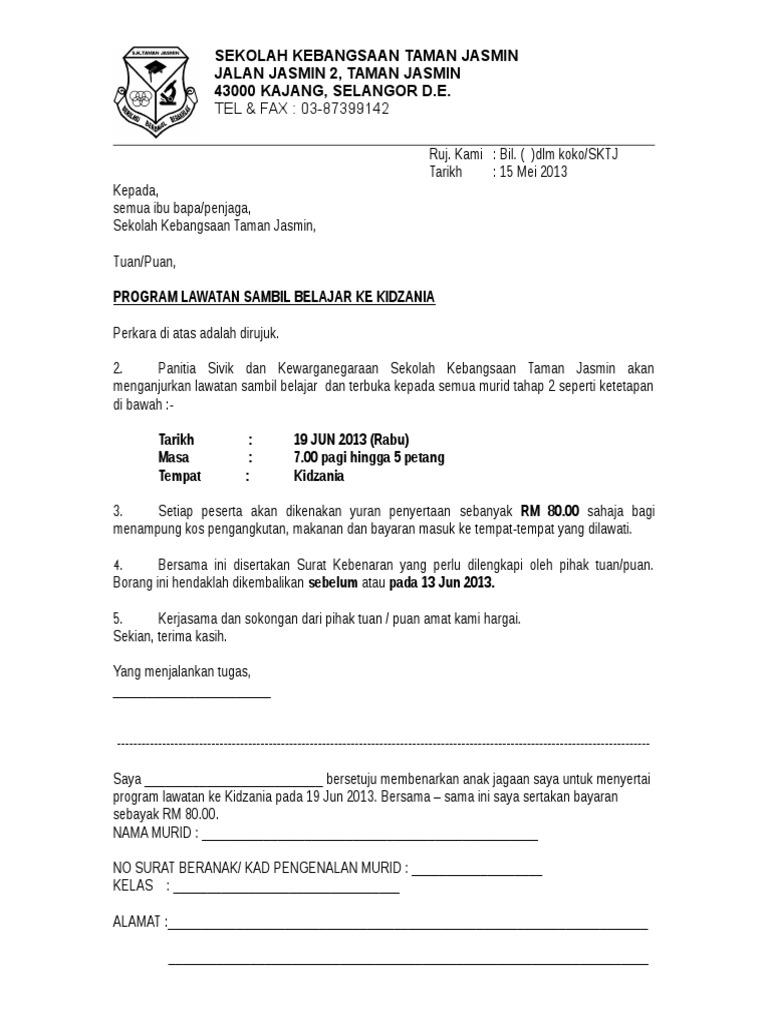 … dengan ini memberi pengakuan bahawa saya membenarkan anak saya / anak jagaan saya seperti nama tersebut di atas untuk menyertai program. Sehubungan dengan itu, kami ingin memohon. Surat kebenaran ibu bapa/penjaga menyertai program anjuran kolej universiti islam melaka (kuim). Bagaimanakah ibu bapa dapat mengetahui jika anak mereka sudah bersedia untuk. Dengan kerelaan hati saya : Savesave surat kebenaran ibu bapa untuk lawatan for later. To view this page ensure that adobe flash player version 10.0.0 or greater is installed. Program lawatan ke kilang batik diadakan bagi memberi peluang kepada pelajar untuk menimba sebanyak mungkin ilmu melalui pelbagai kaedah yang telah dipelajari. Contoh surat minta kebenaran untuk berjumpa meteri. Surat akuan dan kebenaran ibu bapa. Tuan/puan, kebenaran menyertai persatuan agama kristian smk_ saya *membenarkan/ tidak membenarkan, *anak / jagaan saya yang bernama k.p. Saya bersetuju mengizinkan anak / jagaan saya mengambil bahagian dalam sebarang kegiatan dan lawatan sambil belajar yang dianjurkan oleh pihak sekolah, jabatan pelajaran negeri, kementerian pelajaran. Kebenaran daripada tuan untuk ke pameran tersebut.